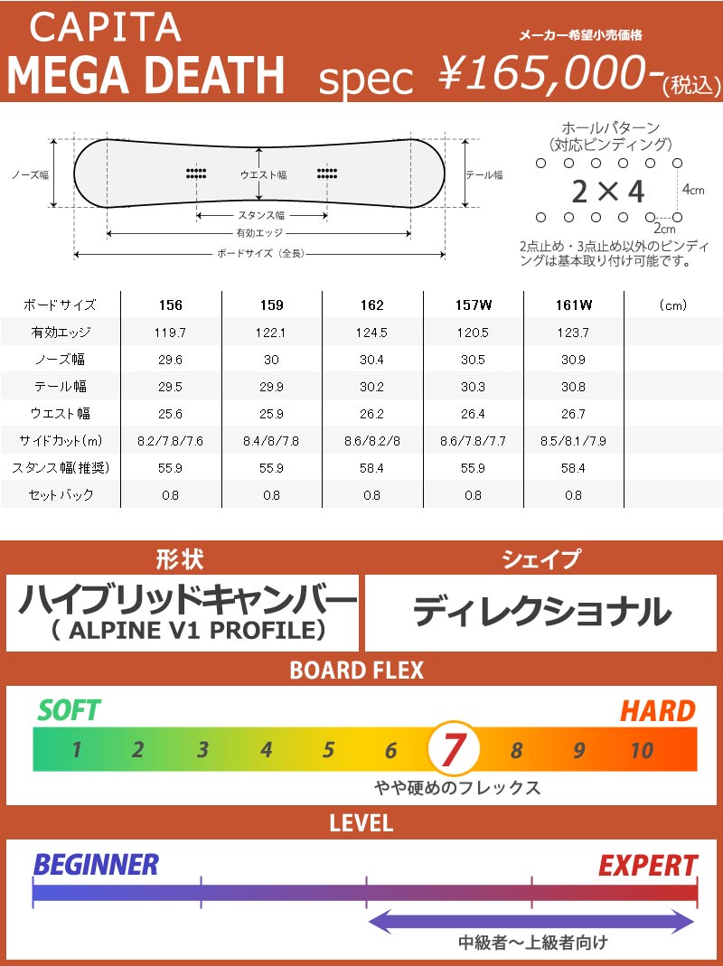 | 滑走適正スタイル | 1.フリーラン 2.パウダーラン 3.カービング 4.ハーフパイプ (スタイルや技術によって変化します) |