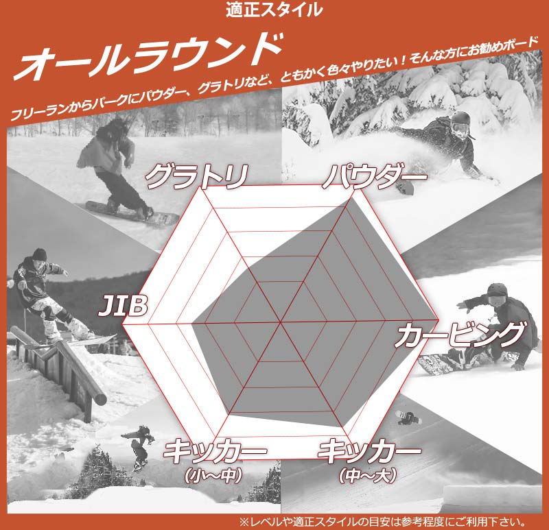 | 適正スタイル | 1.フリーラン2.パウダーラン3.カービング4.ハーフパイプ | ||