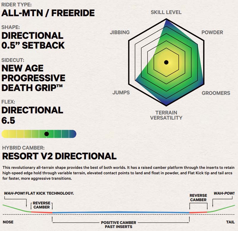 | 形状 | ハイブリッドキャンバー(RESORT V2 DIRECTIONAL)ディレクショナル |