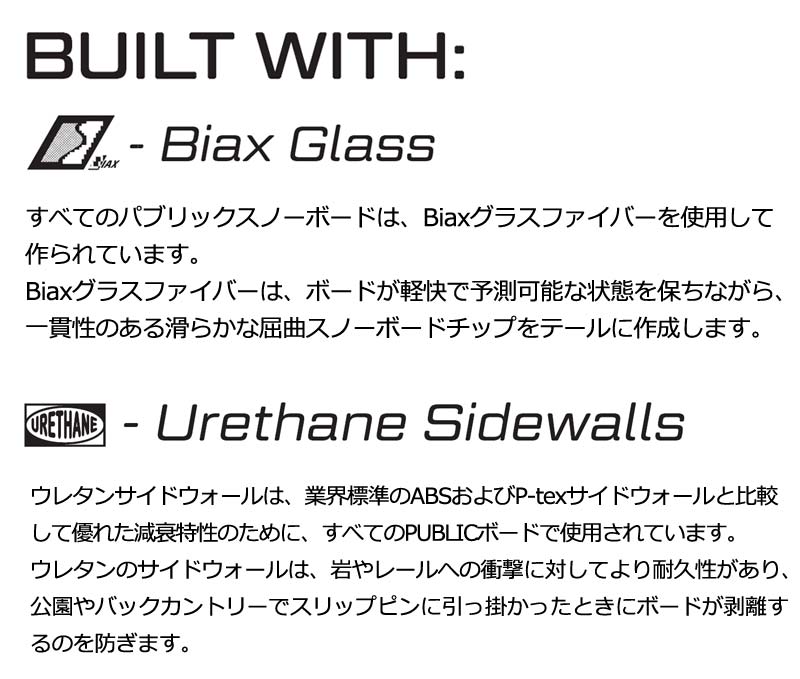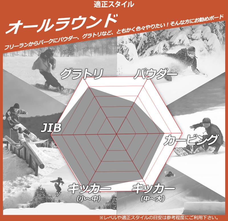 | 滑走適正スタイル | 1.ジブトリック(BOX&レール) 2.ワンメイク(キッカー) 3.グラトリ(グランドトリック) 4.カービング (スタイルや技術によって変化します) |
