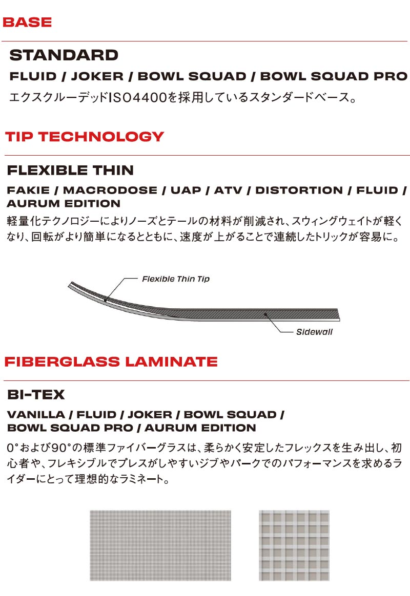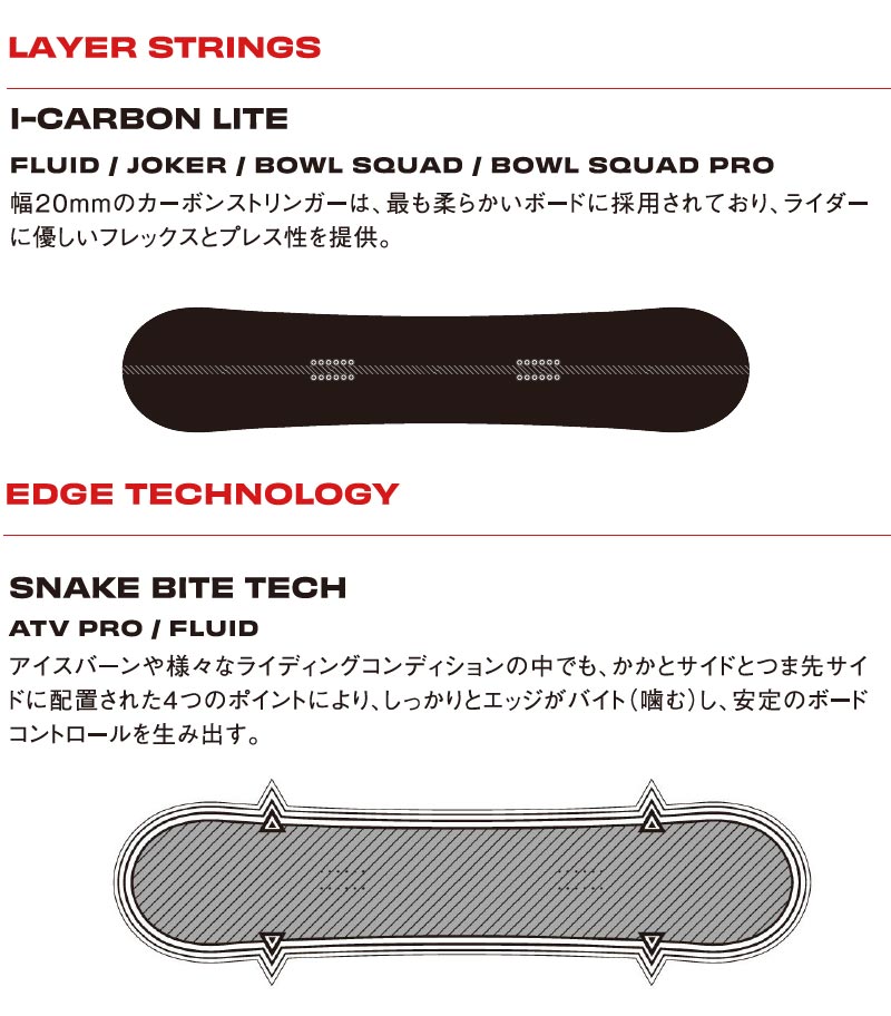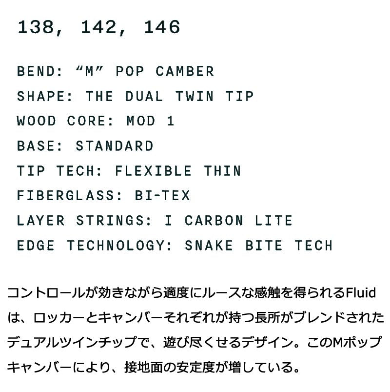 コメント コントロールが効きながら適度にルースな感触を得られるFluidは、ロッカーとキャンバーそれぞれが持つ長所がブレンドされたデュアルツインチップで遊び尽くせるデザイン。