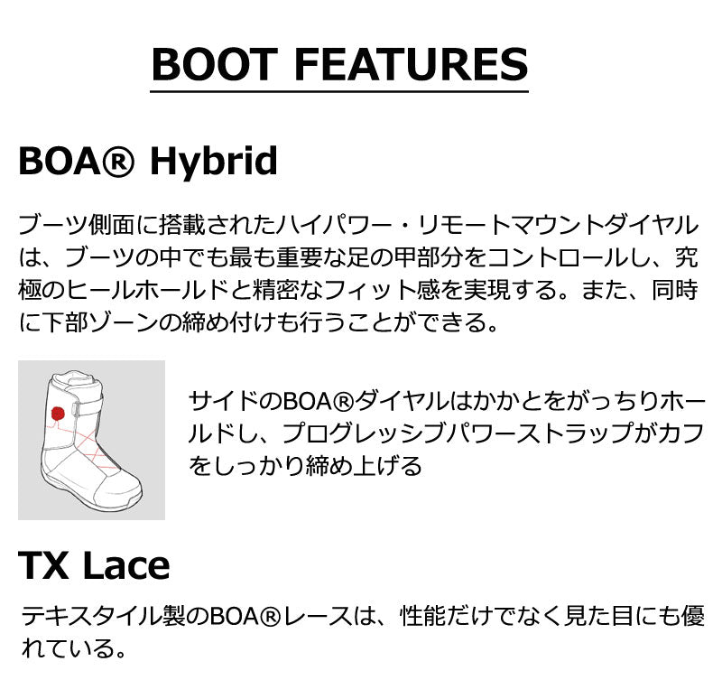 TEAM BOA HYBRIDは、最高のものを求めるライダーのための究極のスノーボードブーツ。 BOAとパワーストラップのハイブリッド・レーシングシステムが足元をしっかりとサポートするこのブーツは、リキッドフィット・テクノロジーによりカスタムフィットし、他に類を見ない履き心地と快適なサポートを実現。 可能な限りリサイクル素材やサステイナブル素材を使用し、環境に配慮したブーツとなっている。 抜群のマルチ性能を誇るTEAM BOA HYBRIDは、パウダーからパークまで、あらゆるシーンに対応する完璧なブーツだ。 |