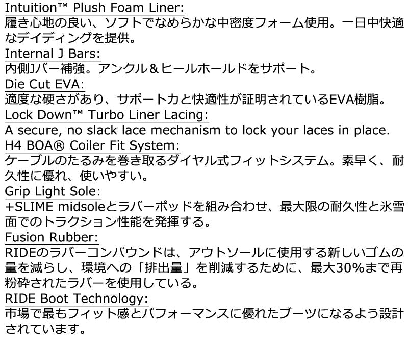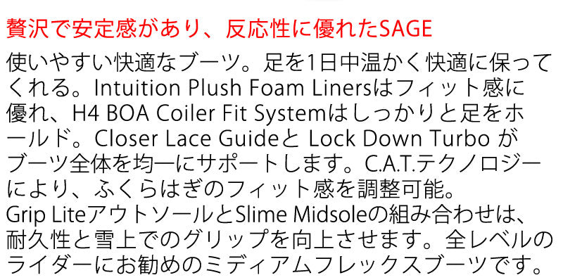 使いやすい快適なブーツ。足を1日中温かく快適に保ってくれる。フィット感に優れ、しっかりと足をホールドしてくれる。耐久性と雪上でのグリップ力が高く、全レベルのライダーにオススメのブーツ。 ブーツとバインディングの相性やフィッティング、サイズ感に関して等、ご不明な点があればお気軽にお問い合わせください。サイズ交換も当店在庫有りの範囲で対応可能ですので、詳しくはサイズ交換リンクをご確認下さい。 |