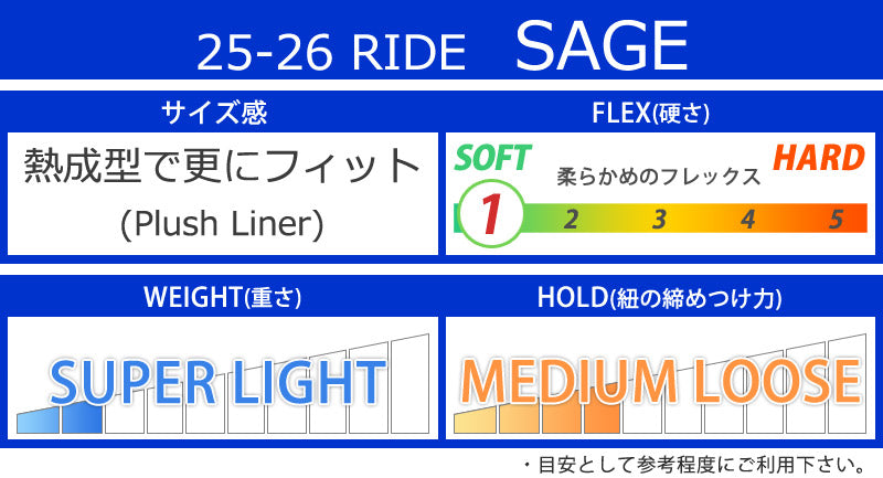 | ベストマッチ ビンディング | ・RIDE/ライド ※ご使用サイズやモデル等で変わる部分もございますのであくまで目安としてお考え下さい。 こちらに記載以外のバインディングにも使用可能です。 |
