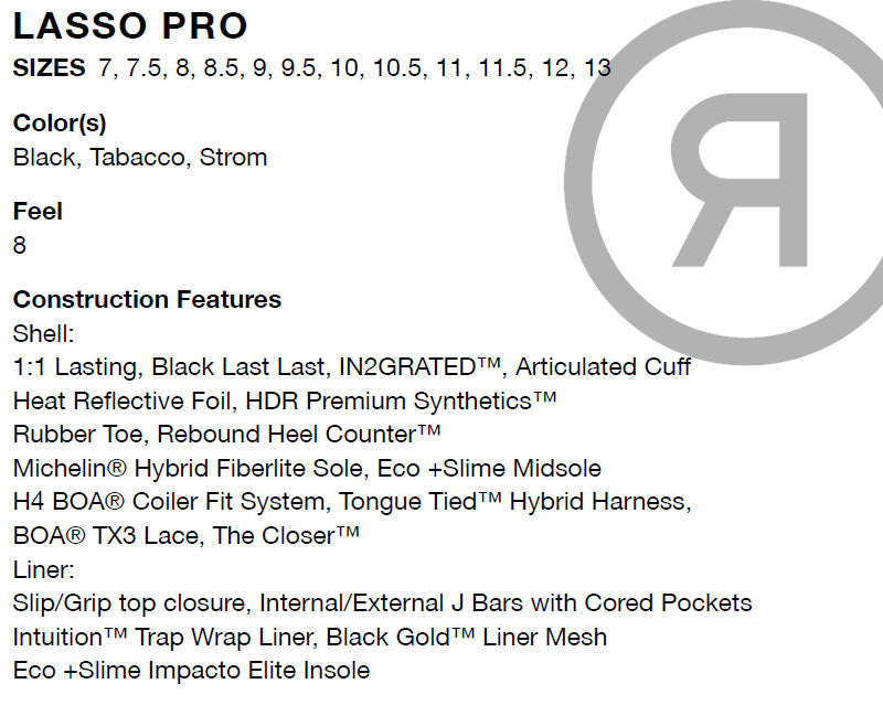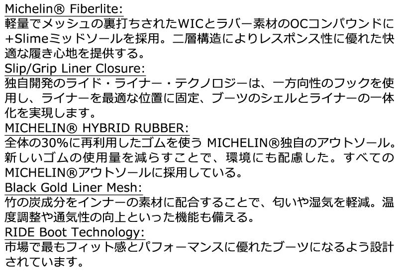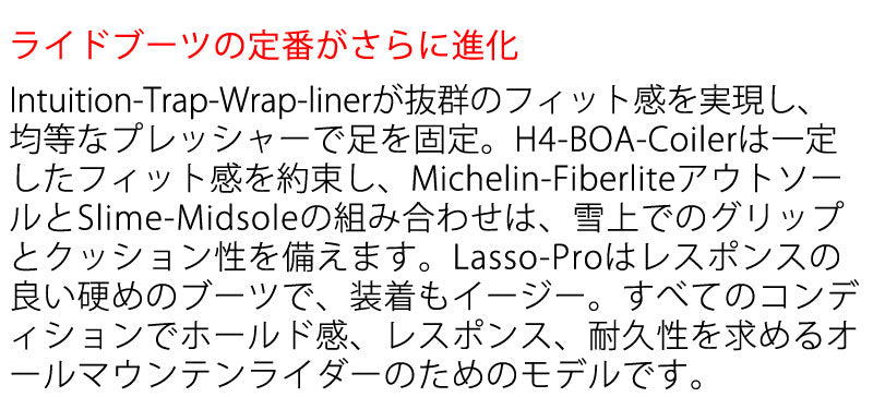 均等なプレッシャーで足を固定。H4 BOA Colilerは一定したフィット感を約束し、Michelin-FiberliteアウトソールとSlime-Midsoleの組み合わせは、雪上のグリップとクッション性を備えます。Lasso-Proはレスポンスの良い硬めのブーツで、装着もイージー。すべてのコンディションでホールド感、レスポンス、耐久性を求めるオールラウンダーのためのモデルです。 ブーツとバインディングの相性やフィッティング、サイズ感に関して等、ご不明な点があればお気軽にお問い合わせください。サイズ交換も当店在庫有りの範囲で対応可能ですので、詳しくはサイズ交換リンクをご確認下さい。 |