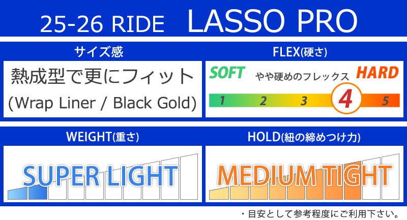 | ベストマッチ ビンディング | ・RIDE/ライド ※ご使用サイズやモデル等で変わる部分もございますのであくまで目安としてお考え下さい。 こちらに記載以外のバインディングにも使用可能です。 |