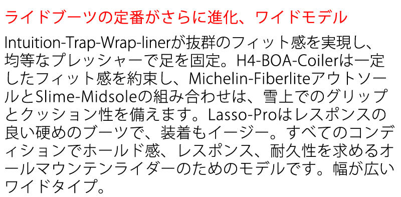 均等なプレッシャーで足を固定。H4 BOA Colilerは一定したフィット感を約束し、Michelin-FiberliteアウトソールとSlime-Midsoleの組み合わせは、雪上のグリップとクッション性を備えます。Lasso-Proはレスポンスの良い硬めのブーツで、装着もイージー。すべてのコンディションでホールド感、レスポンス、耐久性を求めるオールラウンダーのためのモデルです。WIDEフィットバージョン。 ブーツとバインディングの相性やフィッティング、サイズ感に関して等、ご不明な点があればお気軽にお問い合わせください。サイズ交換も当店在庫有りの範囲で対応可能ですので、詳しくはサイズ交換リンクをご確認下さい。 |