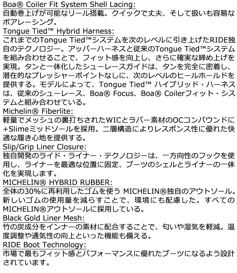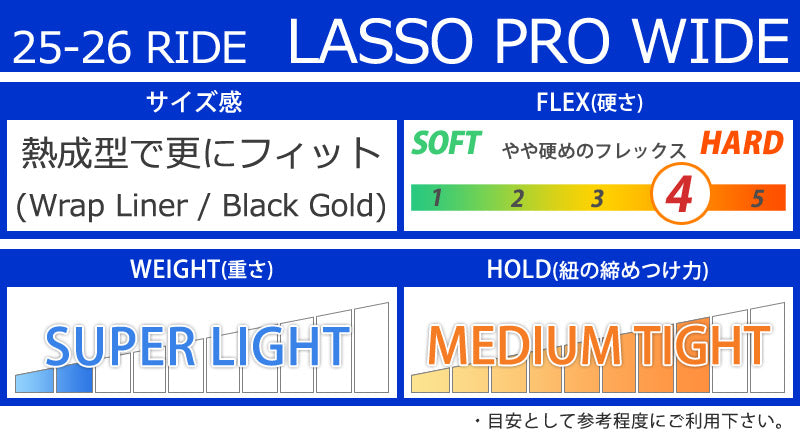 | ベストマッチ ビンディング | ・RIDE/ライド ※ご使用サイズやモデル等で変わる部分もございますのであくまで目安としてお考え下さい。 こちらに記載以外のバインディングにも使用可能です。 |