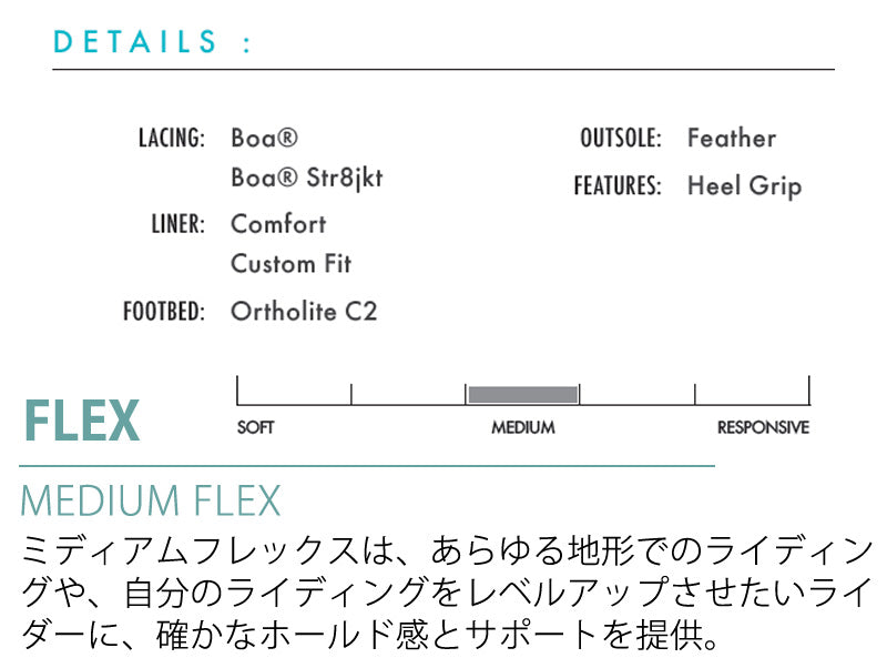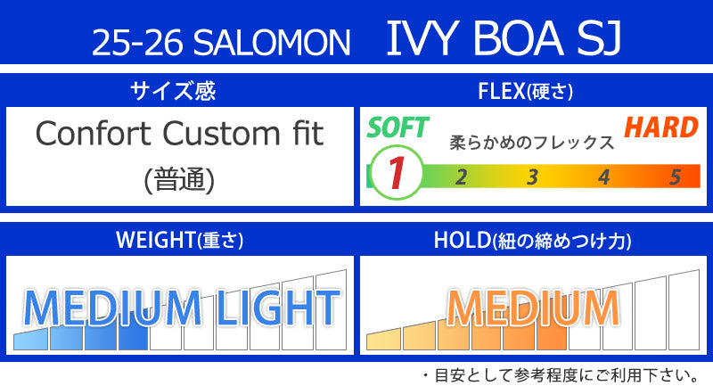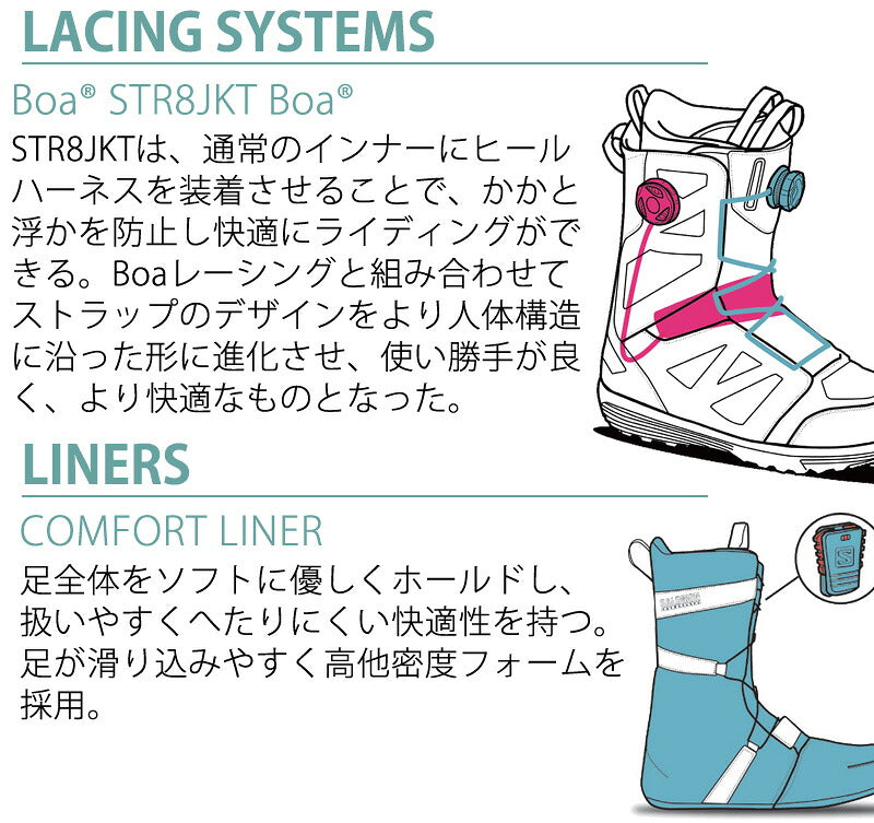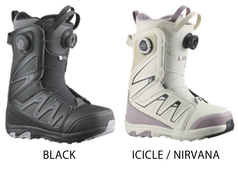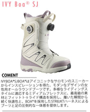 IVYBOA?SJBOA?はアイコニックなサロモンのスニーカーからインスピレーションを得た、モダンなデザインの女性用オールラウンドブーツです。多様なライディングスタイルに適応するミディアムフレックスに、最高級の素材とフィットトゥライド構造を採用し、履いた瞬間から続く快適性と、BOA?を採用したSTR8JKTハーネスによるブーツと足の圧倒的な一体感を提供します。 ブーツとバインディングの相性やフィッティング、サイズ感に関して等、ご不明な点があればお気軽にお問い合わせください。サイズ交換も当店在庫有りの範囲で対応可能ですので、詳しくはサイズ交換リンクをご確認下さい。 |