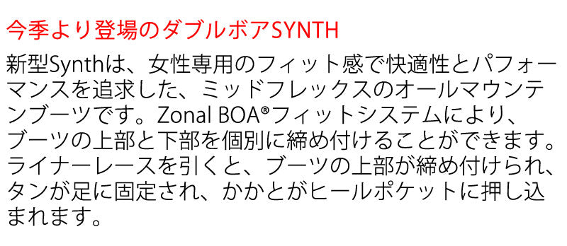 新型SYNTHは、女性専用のフィット感で快適性とパフォーマンスを追求した、ミッドフレックスのオールマウンテンブーツです。Zonal Boaフィットシステムにより、ブーツ上部と下部を個別に締め付けることができます。ライナーレースを引くと、ブーツの上部が締め付けられ、タンが足に固定され、かかとがヒールポケットに押し込められます。 ブーツとバインディングの相性やフィッティング、サイズ感に関して等、ご不明な点があればお気軽にお問い合わせください。サイズ交換も当店在庫有りの範囲で対応可能ですので、詳しくはサイズ交換リンクをご確認下さい。 |
