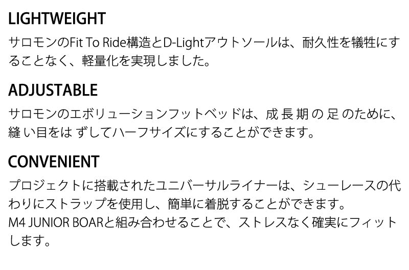 ProjectBOA?は大人顔負けのルックス、フィーリング、ライディングを求めるキッズのためのブーツです。上達したいキッズにぴったりな、BOA?システムを採用した利便性を追求したデザインと、柔らかいフレックスが安全で快適なフィット感を提供します、調整可能なインソールとライナーストラップが脱ぎ履きのしやすさとすぐに大きくなる足に対応します。 ブーツとバインディングの相性やフィッティング、サイズ感に関して等、ご不明な点があればお気軽にお問い合わせください。サイズ交換も当店在庫有りの範囲で対応可能ですので、詳しくはサイズ交換リンクをご確認下さい。 |