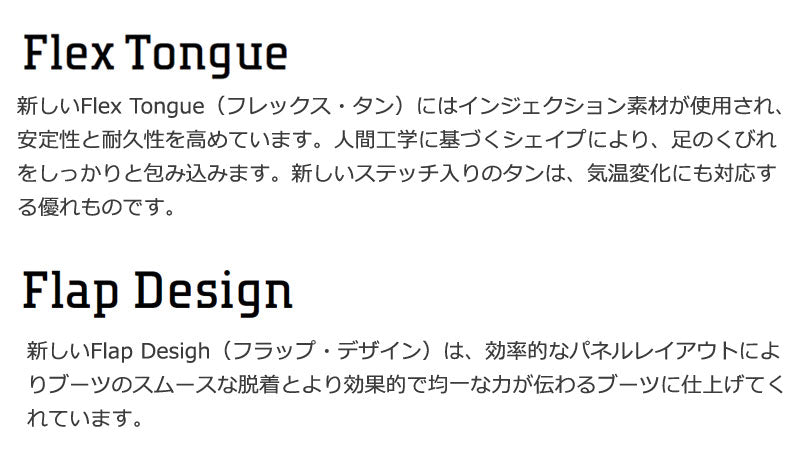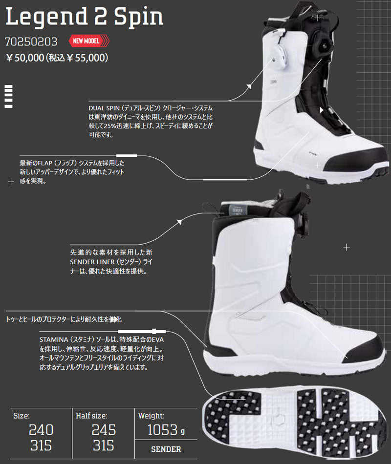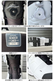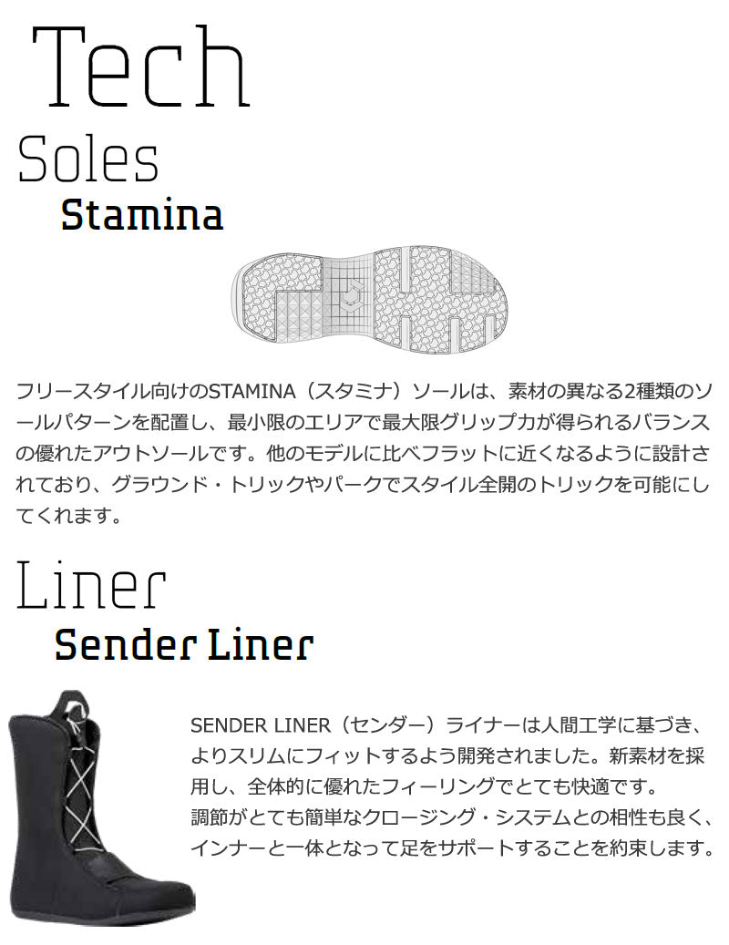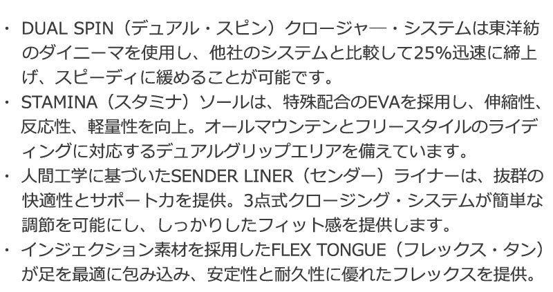 25%迅速に締上げ、スピーディに緩めることが可能です。 ・ STAMINA(スタミナ)ソールは、特殊配合のEVAを採用し、伸縮性、反応性、軽量性を向上。オールマウンテンとフリース タイルのライディングに対応するデュアルグリップエリアを備えています。 ・ 人間工学に基づいたSENDER LINER(センダー)ライナーは、抜群の快適性とサポート力を提供。3点式クロージング・ システムが簡単な調節を可能にし、しっかりしたフィット感を提供します。 ・ インジェクション素材を採用したFLEX TONGUE(フレックス・タン)が足を最適に包み込み、安定性と耐久性に優れたフレ ックスを提供。 ブーツとバインディングの相性やフィッティング、サイズ感に関して等、ご不明な点があればお気軽にお問い合わせください。サイズ交換も当店在庫有りの範囲で対応可能ですので、詳しくはサイズ交換リンクをご確認下さい。 |