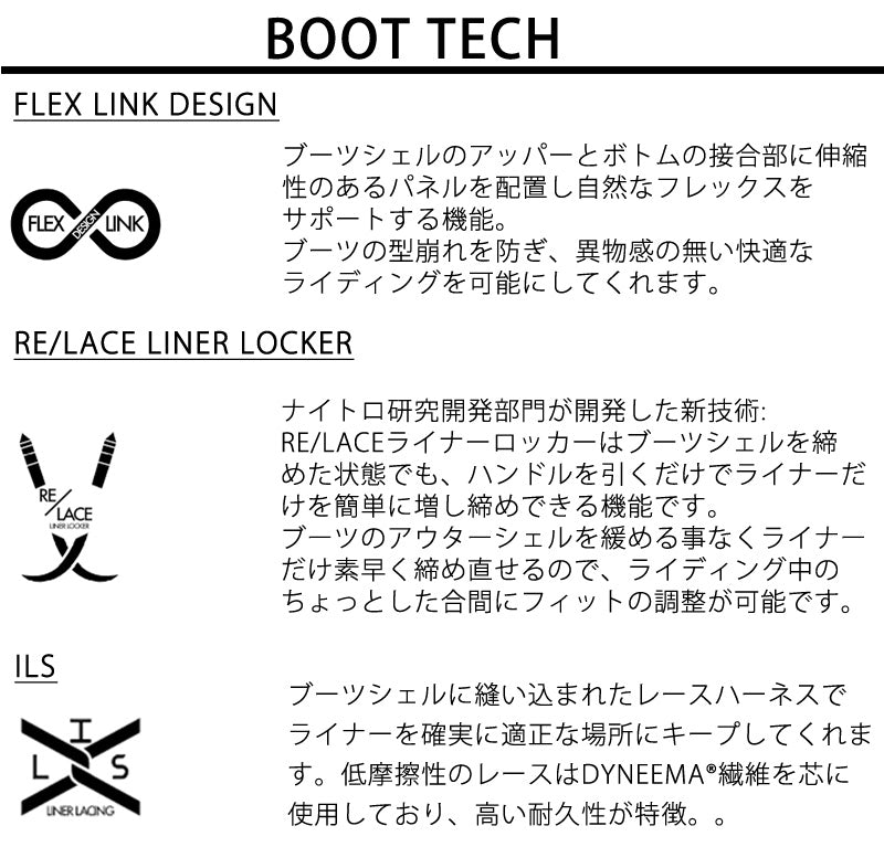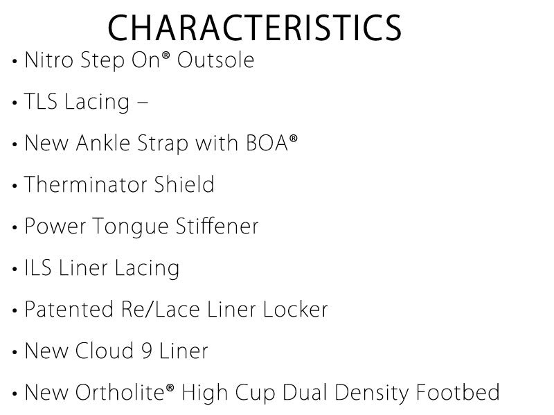 TLSシステムにアンクルバック搭載の、ステップオンブーツ。やや硬めなブーツがしっかりとしたレスポンスを与えてくれて、どんなシチュエーションでもオールラウンドに使用可能。またタン部分のシールドが取り外しで、フレックスの調整が可能。 ※こちらはSTEP-ONビンディング専用のブーツとなります。BURTON,NITRO,FLUX,UNIONのSTEP-ONバインに対応しています。 ブーツとバインディングの相性やフィッティング、サイズ感に関して等、ご不明な点があればお気軽にお問い合わせください。 サイズ交換も当店在庫有りの範囲で対応可能ですので、詳しくはサイズ交換リンクをご確認下さい。 ブーツとバインディングの相性やフィッティング、サイズ感に関して等、ご不明な点があればお気軽にお問い合わせください。サイズ交換も当店在庫有りの範囲で対応可能ですので、詳しくはサイズ交換リンクをご確認下さい。 |