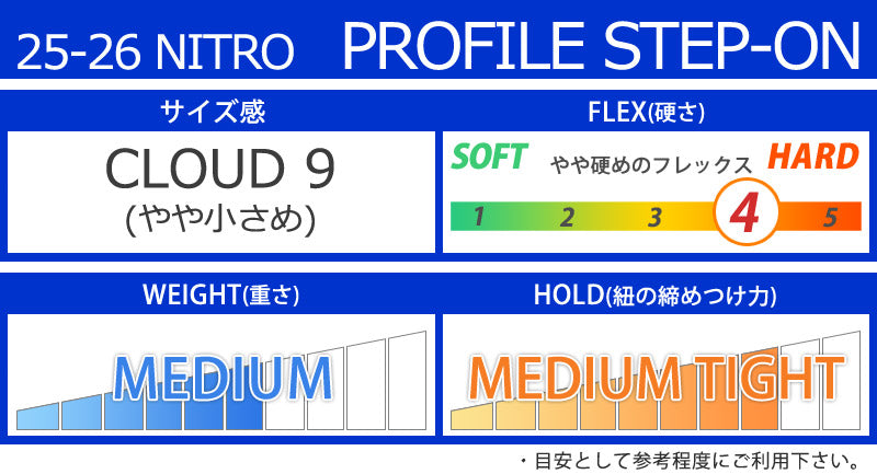 | ベストマッチ ビンディング | ・NITRO/ナイトロ ※ご使用サイズやモデル等で変わる部分もございますのであくまで目安としてお考え下さい。 こちらに記載以外のバインディングにも使用可能です。 |