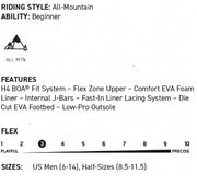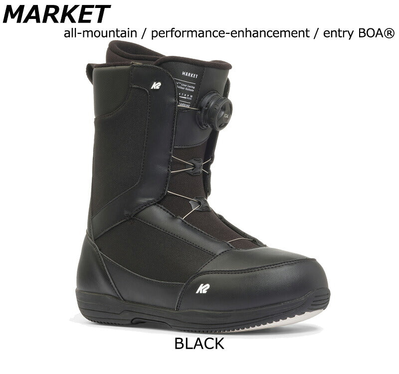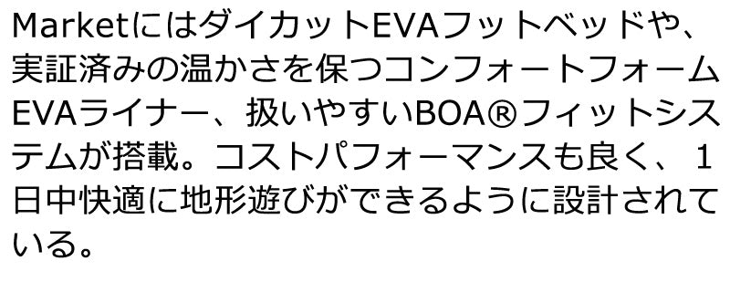 MarketにはダイカットEVAフットベッドや、実証済みの温かさを保つコンフォートフォームEVAライナー、扱いやすいBOAフィットシステムが搭載。コストパフォーマンスも良く、1日中快適に地形遊びができるように設計されている。
