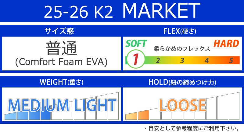| ベストマッチ ビンディング | ・K2/ケーツー ※ご使用サイズやモデル等で変わる部分もございますのであくまで目安としてお考え下さい。 こちらに記載以外のバインディングにも使用可能です。 |