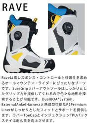 Raveは高レスポンス・コントロールと快適性を求めるオールマウンテン・ライダーにぴったりなブーツです。SureGripラバーアウトソールはしっかりとしたグリップ力を提供してくれるので色々な地形を探索することが可能です。Dual BOA? System、External AnkelHarnessと熱成型可能なP2 Premium Linerがしっかりとし たフィットとサ ポ ートを 提 供します 。ラバ ーToeCapとインジェクションTPUバックステイは耐久性を向上させます。 ブーツとバインディングの相性やフィッティング、サイズ感に関して等、ご不明な点があればお気軽にお問い合わせください。サイズ交換も当店在庫有りの範囲で対応可能ですので、詳しくはサイズ交換リンクをご確認下さい。 |