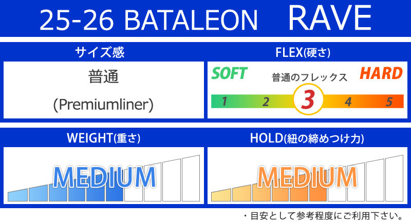 | ベストマッチ ビンディング | ・BATALEON/バタレオン ※ご使用サイズやモデル等で変わる部分もございますのであくまで目安としてお考え下さい。 こちらに記載以外のバインディングにも使用可能です。 |