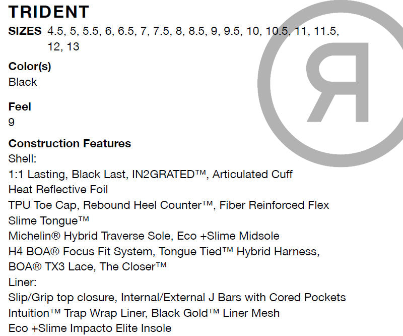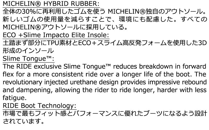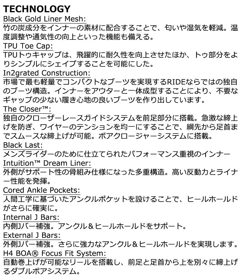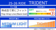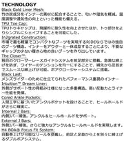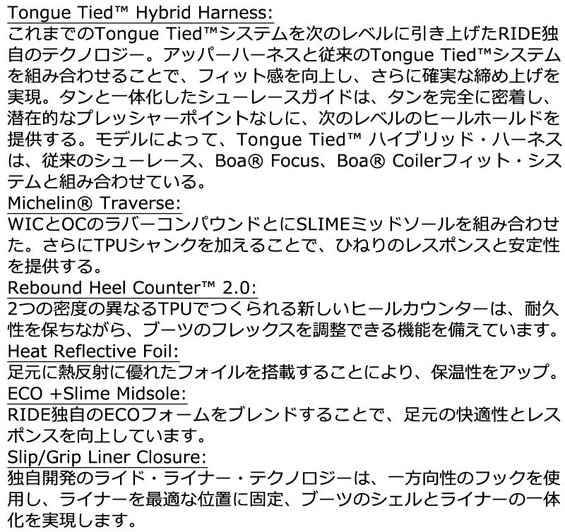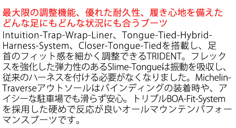 トリプルボアを採用し、足首のフィット感を細かく調節できるTRIDENT。フレックスを強化した弾力性のあるSlime-Tongueは振動を吸収し、従来のハーネスをつける必要がなくなりました。Michelin-Traverseアウトソールはバインディングの装着時や、アイシーな駐車場でも滑らず安心。 ブーツとバインディングの相性やフィッティング、サイズ感に関して等、ご不明な点があればお気軽にお問い合わせください。サイズ交換も当店在庫有りの範囲で対応可能ですので、詳しくはサイズ交換リンクをご確認下さい。 |