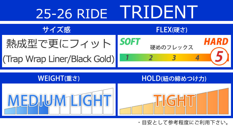 | ベストマッチ ビンディング | ・RIDE/ライド ※ご使用サイズやモデル等で変わる部分もございますのであくまで目安としてお考え下さい。 こちらに記載以外のバインディングにも使用可能です。 |