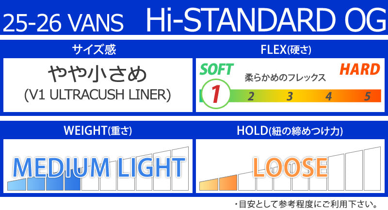 Hi-Standard OGは、Vansのベストセラーブーツとして、クラシックなスタイルとモダンなパフォーマンス性能を表現し続けている。 伝統的なレースアップクロージャーの快適さと親しみやすい感触が、インステップレースロックアウトやインターナルウェブハーネスなどの機能によってさらにサポートされている。 また、V1 Waffle Lugアウトソールとサイドストライが、VANSの普遍的なスタイルを象徴している。 ブーツとバインディングの相性やフィッティング、サイズ感に関して等、ご不明な点があればお気軽にお問い合わせください。サイズ交換も当店在庫有りの範囲で対応可能ですので、詳しくはサイズ交換リンクをご確認下さい。 |