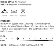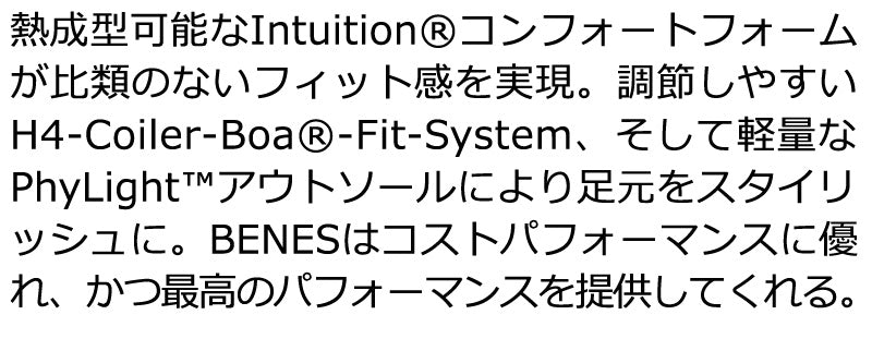 コメント 熱成型可能なIntuitionコンフォートフォームが比類のないフィット感を実現。調節しやすいH4-Coiler-Boa-Fit-System、そして軽量なPhyLightアウトソールにより足元をスタイリッシュに。BENESはコストパフォーマンスに優れ、かつ最高のパフォーマンスを提供してくれる。