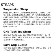 コストパフォーマンスが高い上に、フィッティングもパフォーマンスも折り紙付き。 ブーツにぴったりフィットする柔軟なストラップ、程よいフレックスが疲れにくく1日を通して快適なライディングを楽しめる。 軽量でありながら耐久性を維持し、ライディングを抜群のサポート力でフォローする。初級者から中級者の基本滑走にマッチしたビンディングだ。 バインディングとブーツの相性やフィッティングに関して等、ご不明な点があればお気軽にお問い合わせください。 ※滑走での振動やストラップの着脱等でビスを使用している部分は緩んできますので、締り具合など滑走前に必ずご確認をお願いします。またご使用のブーツとストラップの調整をお願いいたします。調整が適切でない場合、負荷が集中し破損の原因となります。 |