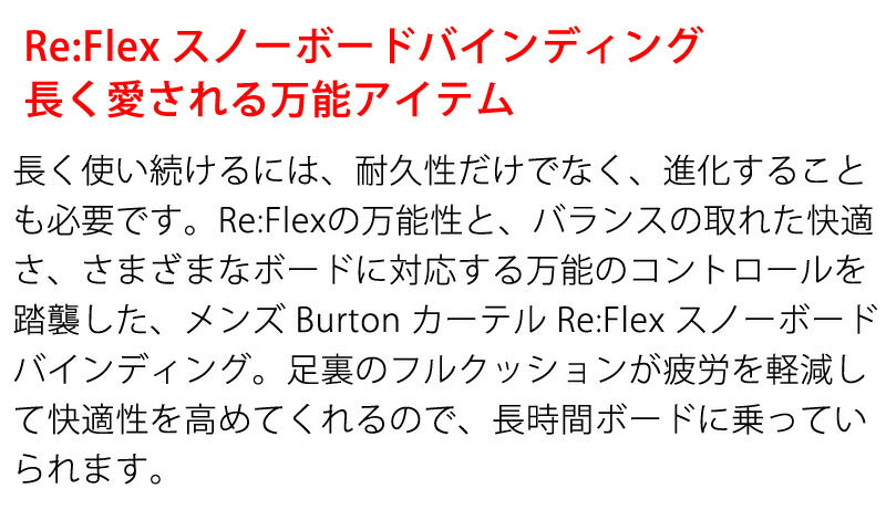 長く使い続けるには、耐久性だけでなく、進化することも必要です。Re:Flexの万能性と、バランスの取れた快適さ、さまざまなボードに対応する万能のコントロールを踏襲した、メンズ Burton カーテル Re:Flex スノーボードバインディング。足裏のフルクッションが疲労を軽減して快適性を高めてくれるので、長時間ボードに乗っていられます。 バインディングとブーツの相性やフィッティングに関して等、ご不明な点があればお気軽にお問い合わせください。 ※滑走での振動やストラップの着脱等でビスを使用している部分は緩んできますので、締り具合など滑走前に必ずご確認をお願いします。またご使用のブーツとストラップの調整をお願いいたします。調整が適切でない場合、負荷が集中し破損の原因となります。 |