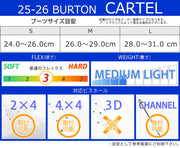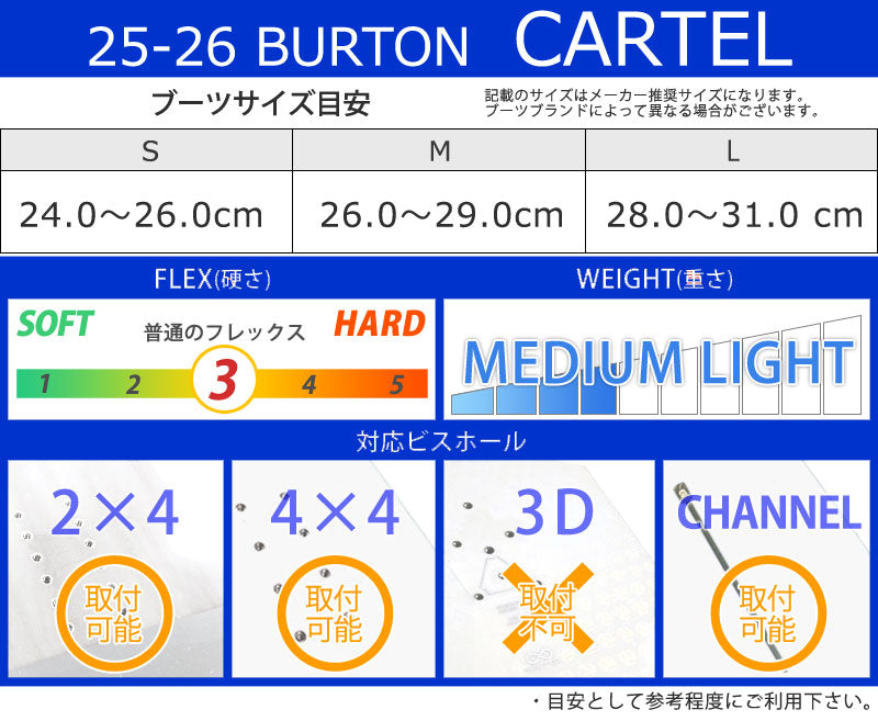 | ベストマッチブーツ | ・BURTON/バートン ※ご使用サイズやモデル等で変わる部分もございますのであくまで目安としてお考え下さい。 こちらに記載以外のバインディングにも使用可能です。 |