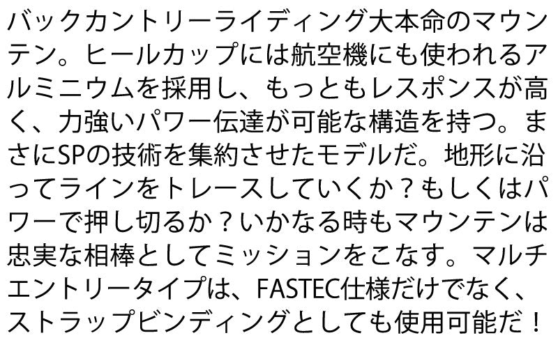 コメント バックカントリーライディング大本命のマウンテン。ヒールカップには航空機にも使われるアルミニウムを採用し、もっともレスポンスが高く、力強いパワー伝達が可能な構造を持つ。まさにSPの技術を集約させたモデルだ。地形に沿ってラインをトレースしていくか?もしくはパワーで押し切るか?いかなる時もマウンテンは忠実な相棒としてミッションをこなす。マルチエントリータイプは、FASTEC仕様だけでなく、ストラップビンディングとしても使用可能だ!
