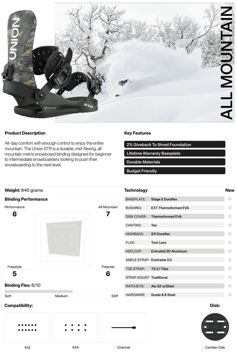 Union STRは、スノーボードを次のレベルに引き上げたい初心者から中級者向けの、耐久性があり、中程度のフレックスを備えたオールマウンテンのメンズスノーボードバインディングです。
