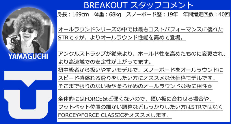 ※滑走での振動やストラップの着脱等でビスを使用している部分は緩んできますので、締り具合など滑走前に必ずご確認をお願いします。またご使用のブーツとストラップの調整をお願いいたします。調整が適切でない場合、負荷が集中し破損の原因となります。