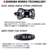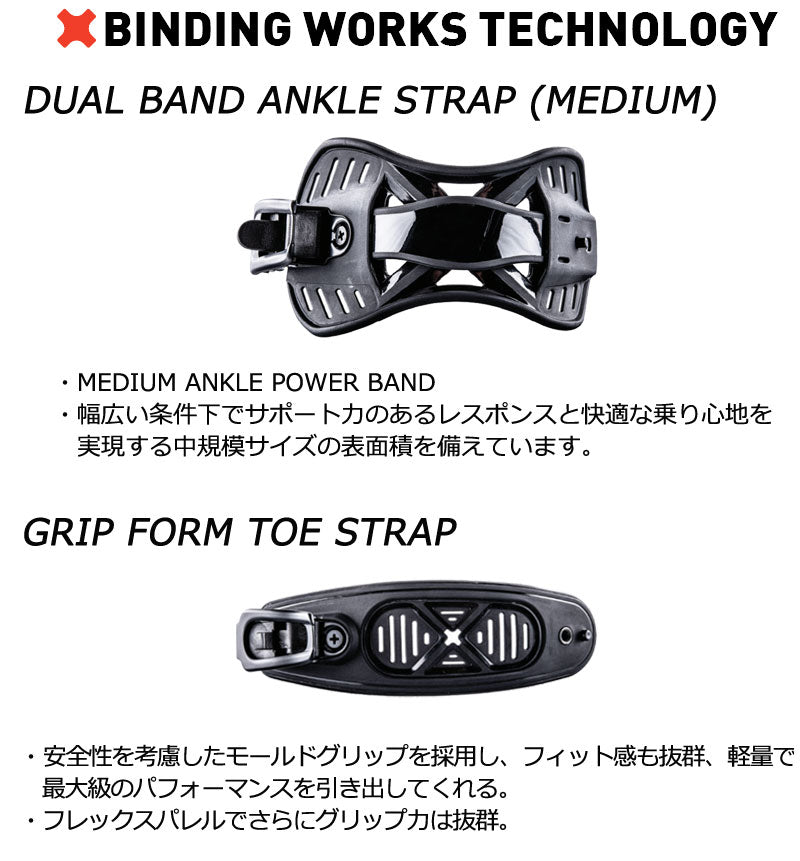 ※滑走での振動やストラップの着脱等でビスを使用している部分は緩んできますので、締り具合など滑走前に必ずご確認をお願いします。またご使用のブーツとストラップの調整をお願いいたします。調整が適切でない場合、負荷が集中し破損の原因となります。