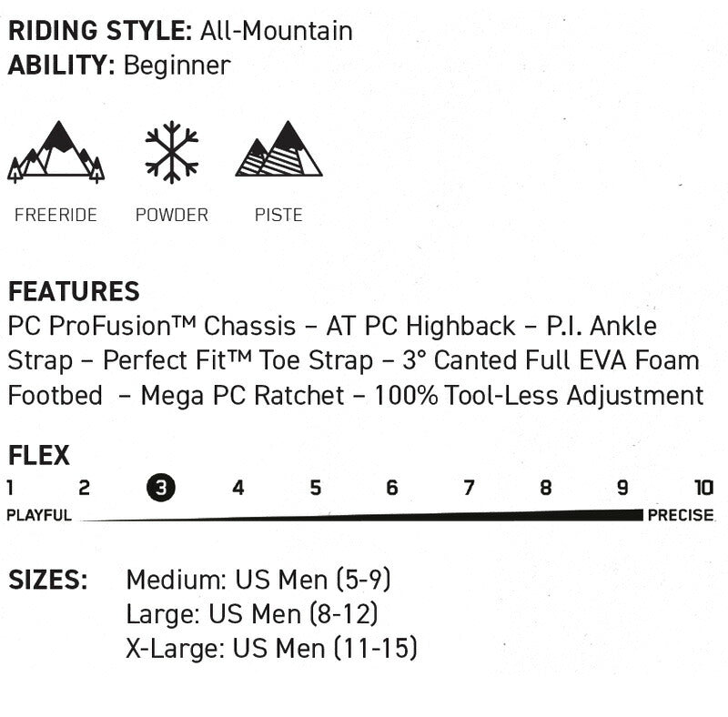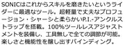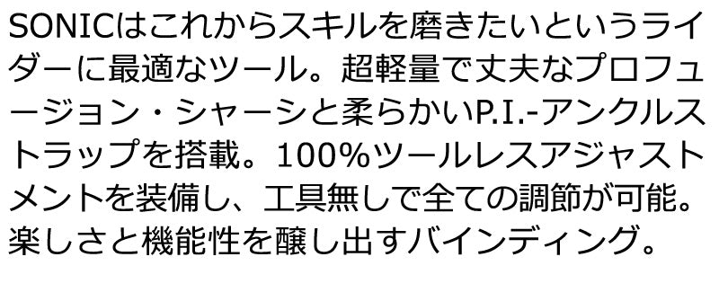 コメント SONICはこれからスキルを磨きたいというライダーに最適なツール。 超軽量で丈夫なプロフュージョン・シャーシと柔らかいP.I.-アンクルス トラップを搭載。100%ツールレスアジャストメントを装備し、工具無しで全ての調節が可能。楽しさと機能性を醸し出すバインディング。