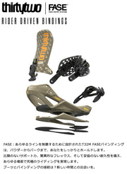 あらゆるラインを制覇するために設計されたT32M FASEバインディングは、パウダーからパークまで、あなたをしっかりとホールドします。 比類のないサポート力、驚異的なフレックス、そして妥協のない耐久性を備え、あらゆる場面で究極のライディングを実現します。 ブーツとバインディングの接続は? 新しい仲間との出会いを。 このプロジェクトは複数のブランドがかかわった巨大コラボレーションプロジェクトです。 構想は6年前から始まり、新たな革新的バインディングをマーケットに届けることができるよう多くの人間が尽力してきました。 イージーエントリーやファストエントリーというカテゴリーが大きなブームとなっている昨今、私たちはブームにただ乗っかるということはしたくありませんでした。 もし自分たちがファストエントリーバインディングをリリースするのであれば、パフォーマンスを最重要視し、利点を作るために欠点を作り出すようなことは決してしてはならないと強く感じていました。 だからこそ6年という歳月を費やし、欠点のないバインディングを作り上げたのです。 FaseはFast Entryカテゴリーにおいて始めてプロライダーが使用できる高パフォーマンスバインディングをリリースします。 バインディングとブーツの相性やフィッティングに関して等、ご不明な点があればお気軽にお問い合わせください。 ※滑走での振動やストラップの着脱等でビスを使用している部分は緩んできますので、締り具合など滑走前に必ずご確認をお願いします。またご使用のブーツとストラップの調整をお願いいたします。調整が適切でない場合、負荷が集中し破損の原因となります。 |