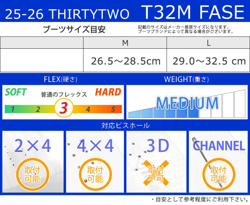 | ベストマッチブーツ | ・THIRTYTWO/サーティーツー ※ご使用サイズやモデル等で変わる部分もございますのであくまで目安としてお考え下さい。 こちらに記載以外のバインディングにも使用可能です。 |