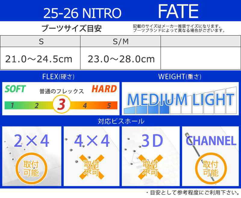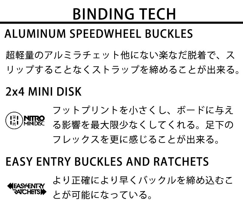 | ベストマッチブーツ | ・NITRO/ナイトロ ※ご使用サイズやモデル等で変わる部分もございますのであくまで目安としてお考え下さい。 こちらに記載以外のバインディングにも使用可能です。 |