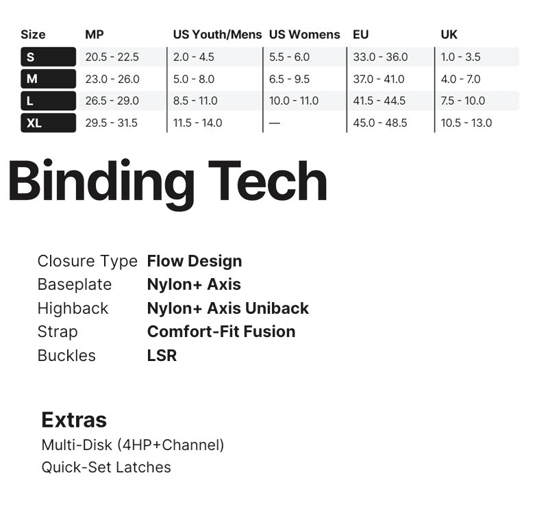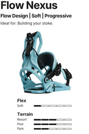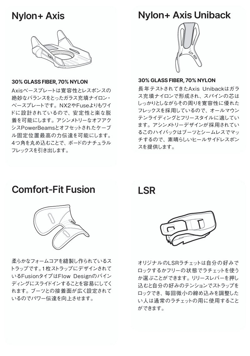 Flow Designラインの中で最もソフトなフレックスを誇るNexusは、ラップタイムを増やし、ストラップを締める時間を減らしたい初心者から中級者ライダーに最適です。 一体型のストラップデザインとリクライニングハイバックにより、数秒でライディングの準備が整います。 トレイルでもパークでも、リラックスした履き心地が、まるでナイフエッジでボードをコントロールしているような感覚を抱かず、自信を持ってライディングをプッシュできる力を与えてくれます。 反転させ、裂く。 フローデザインは、エントリースピード以上のものを提供する。 そのユニークなケーブルシステムは、すべてのモデルにパワフルなフィーリングを与え、ユニークなフュージョンストラップや、伝説的な NX2のようなより硬いモデルでは、そのフィーリングがターボチャージされる。 数十年にわたり洗練されたこのバインディングは、あらゆるコンディションで自身を証明し、忠実なファン軍団を獲得してきた。 あなたもその仲間入りをする準備はできている? 行こう バインディングとブーツの相性やフィッティングに関して等、ご不明な点があればお気軽にお問い合わせください。 ※滑走での振動やストラップの着脱等でビスを使用している部分は緩んできますので、締り具合など滑走前に必ずご確認をお願いします。またご使用のブーツとストラップの調整をお願いいたします。調整が適切でない場合、負荷が集中し破損の原因となります。 |