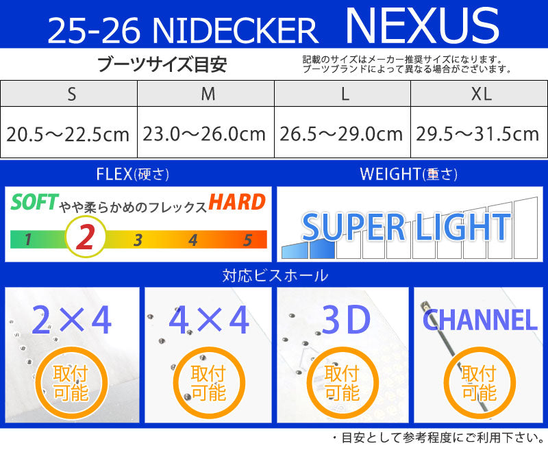 | ベストマッチブーツ | ・NIDECKER/ナイデッカー ※ご使用サイズやモデル等で変わる部分もございますのであくまで目安としてお考え下さい。 こちらに記載以外のバインディングにも使用可能です。 |