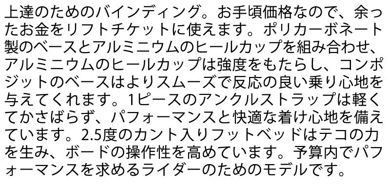 上達のためのバインディング。お手頃価格なので、余ったお金をリフトチケットに使えます。ポリカーボネート製のベースとアルミニウムのヒールカップを組み合わせ、アルミニウムのヒールカップは強度をもたらし、コンポジットのベースはスムーズで反応の良い乗り心地を与えてくれます。1ピースのアンクルストラップは軽くてかさばらず、パーフォーマンスト快適な付け心地を備えています。 バインディングとブーツの相性やフィッティングに関して等、ご不明な点があればお気軽にお問い合わせください。 ※滑走での振動やストラップの着脱等でビスを使用している部分は緩んできますので、締り具合など滑走前に必ずご確認をお願いします。またご使用のブーツとストラップの調整をお願いいたします。調整が適切でない場合、負荷が集中し破損の原因となります。 |
