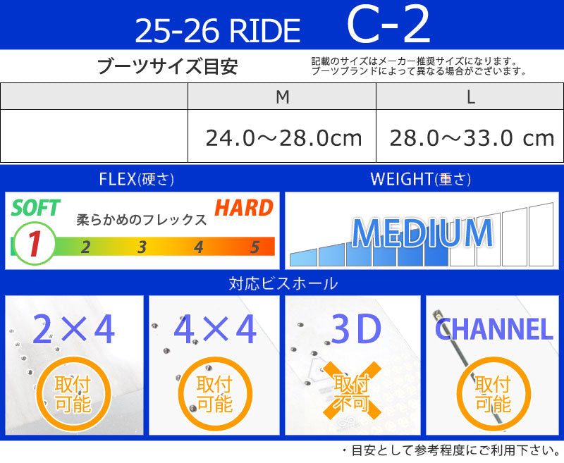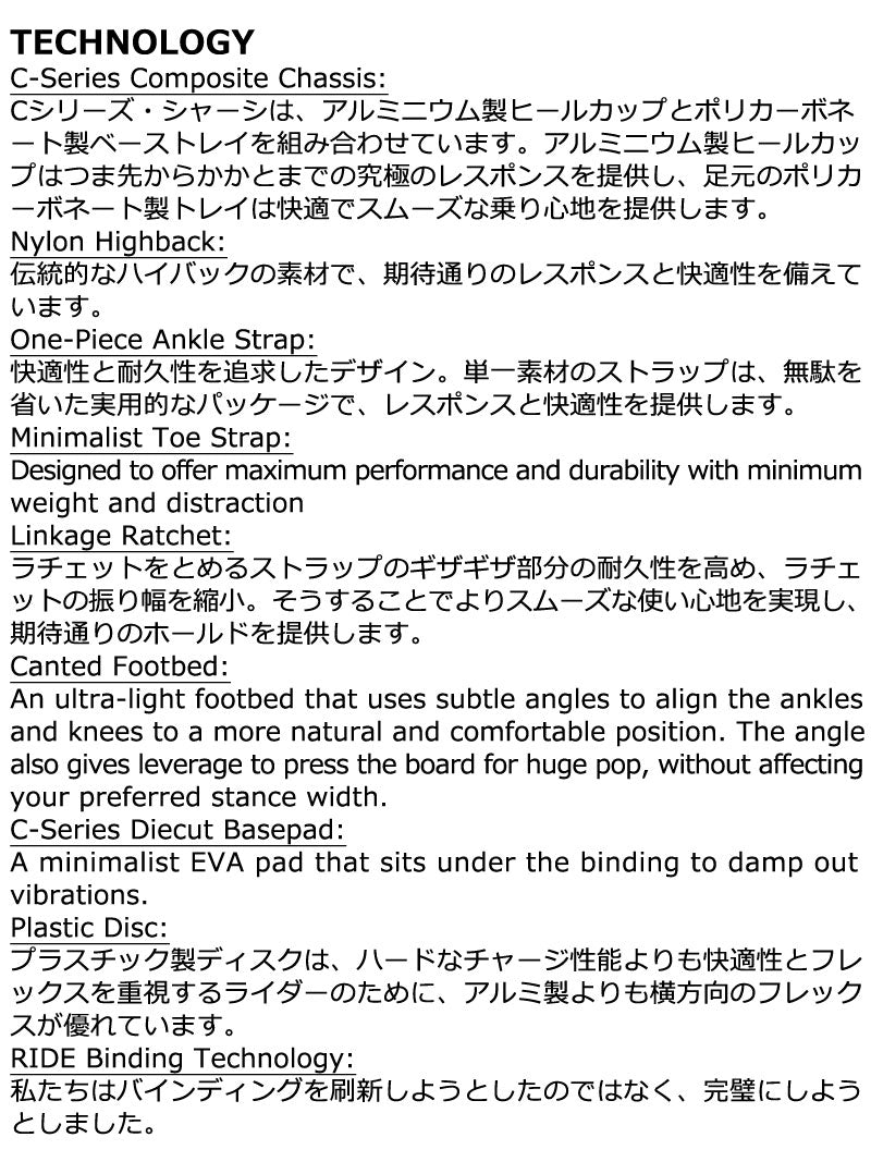 | ベストマッチブーツ | ・RIDE/ライド ※ご使用サイズやモデル等で変わる部分もございますのであくまで目安としてお考え下さい。 こちらに記載以外のバインディングにも使用可能です。 |