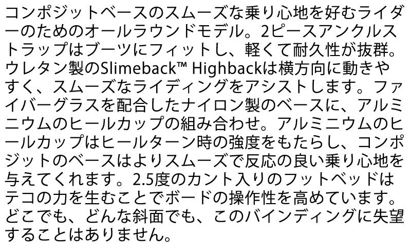 コンポジットベースのスムーズな乗り心地を好むライダーの為のオールラウンドモデル。2ピースアンクルストラップはブーツにフィットし、軽くて耐久性が抜群。ウレタン製のSlimeback highbackは横方向に動きやすく、スムーズなライディングをアシストします。ファイバーグラスを配合したナイロン製のベースに、アルミニウムのヒールカップの組み合わせ。アルミニウムのヒールカップは、ヒールターン時に強度をもたらし、コンポジットのベースはよりスムーズで反応の良い乗り心地を与えてくれます。 バインディングとブーツの相性やフィッティングに関して等、ご不明な点があればお気軽にお問い合わせください。 ※滑走での振動やストラップの着脱等でビスを使用している部分は緩んできますので、締り具合など滑走前に必ずご確認をお願いします。またご使用のブーツとストラップの調整をお願いいたします。調整が適切でない場合、負荷が集中し破損の原因となります。 |