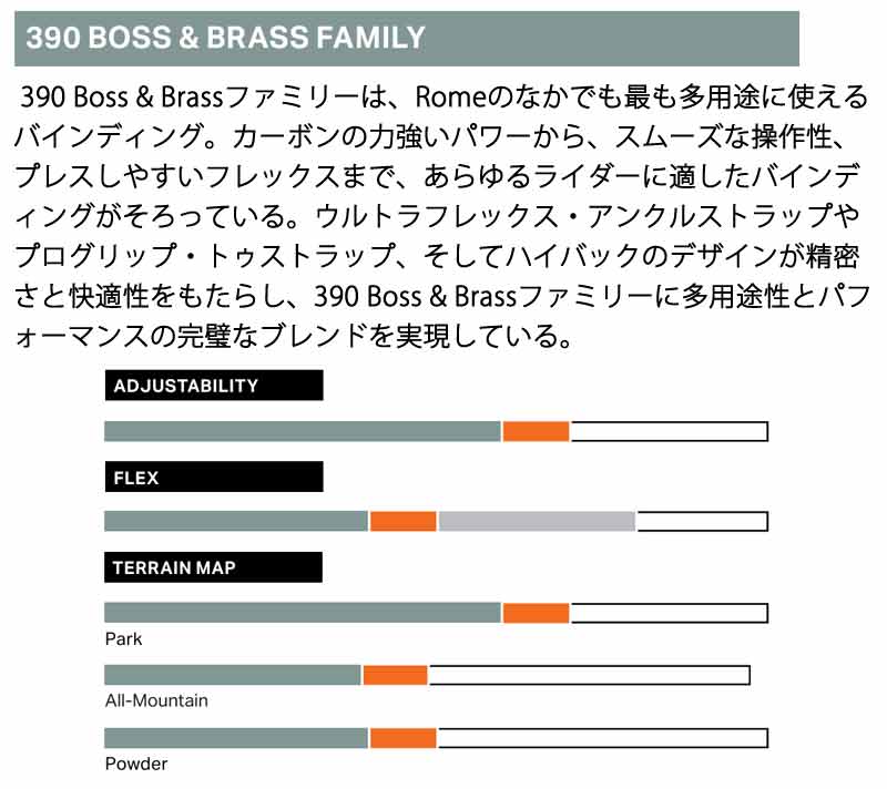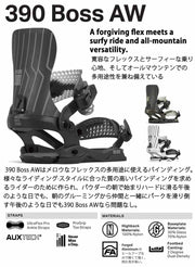 390 Boss AWはメロウなフレックスの多用途に使えるバインディング。様々なライディング?スタイルに合った質の高いバインディングを求めるライダーのために作られ、パウダーの朝で始まりハードに滑る午後のような日でも、朝のグルーミングから仲間と一緒にパークを滑り倒す午後のような日でも390 Boss AWなら問題なし。 バインディングとブーツの相性やフィッティングに関して等、ご不明な点があればお気軽にお問い合わせください。 ※滑走での振動やストラップの着脱等でビスを使用している部分は緩んできますので、締り具合など滑走前に必ずご確認をお願いします。またご使用のブーツとストラップの調整をお願いいたします。調整が適切でない場合、負荷が集中し破損の原因となります。 |