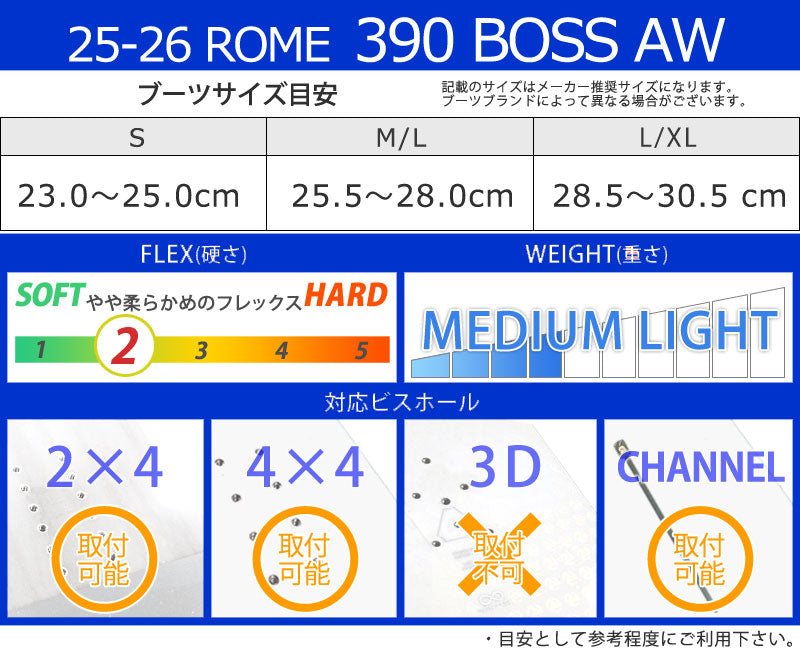 | ベストマッチブーツ | ・ROME/ローム ※ご使用サイズやモデル等で変わる部分もございますのであくまで目安としてお考え下さい。 こちらに記載以外のバインディングにも使用可能です。 |