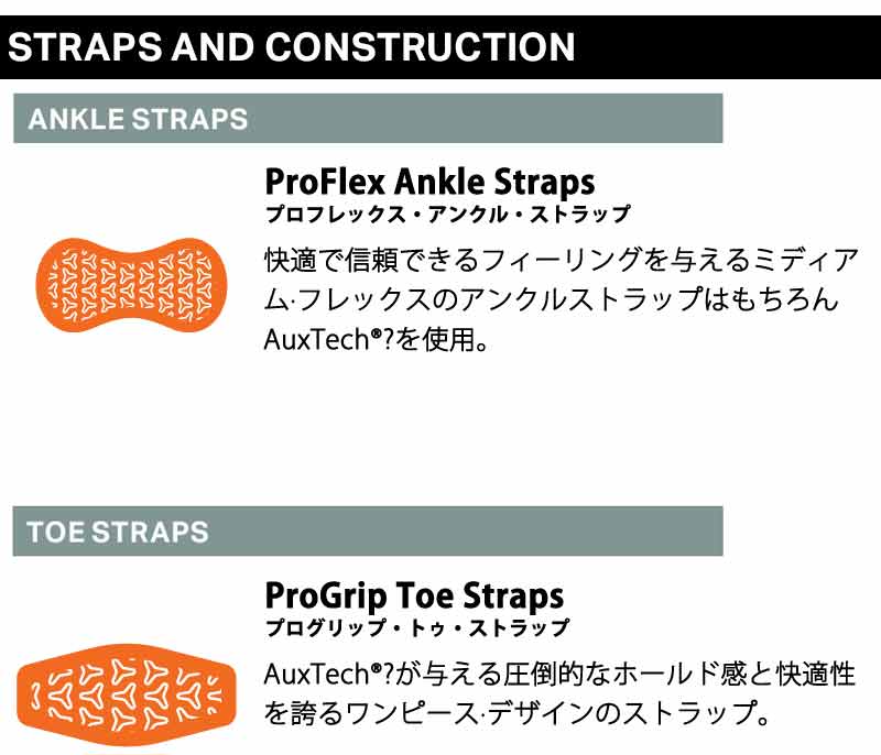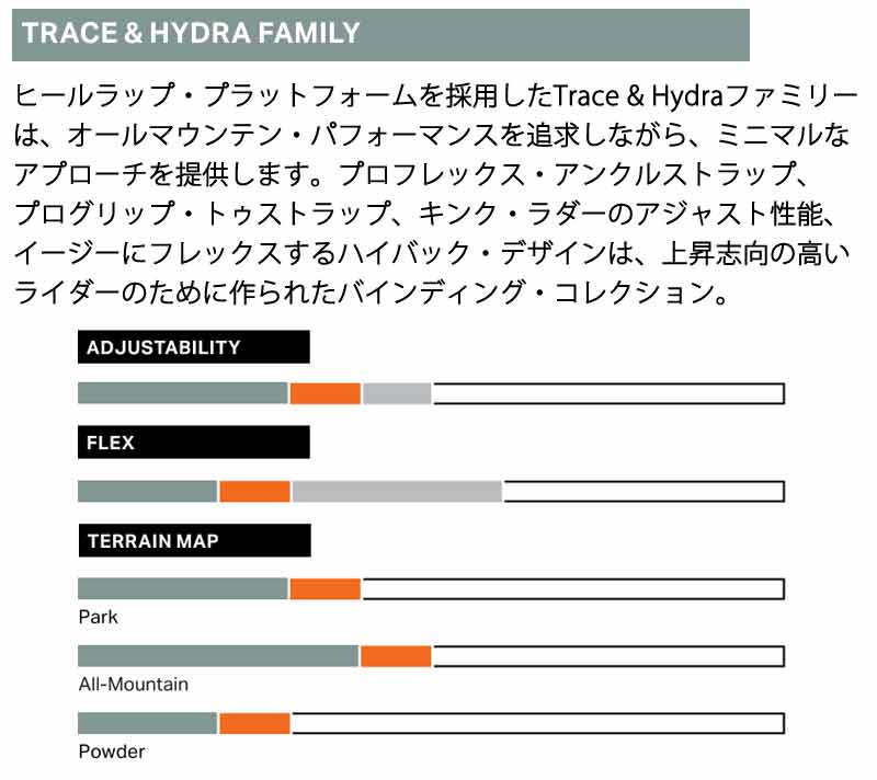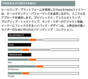 パフォーマンスを高めながらも快適性を求めるライダーのためのTrace HWはあらゆるライディング?スタイルに対応するアジャスト性能を備えたイージーなフレックスのオールマウンテン?バインディング。 バインディングとブーツの相性やフィッティングに関して等、ご不明な点があればお気軽にお問い合わせください。 ※滑走での振動やストラップの着脱等でビスを使用している部分は緩んできますので、締り具合など滑走前に必ずご確認をお願いします。またご使用のブーツとストラップの調整をお願いいたします。調整が適切でない場合、負荷が集中し破損の原因となります。 |