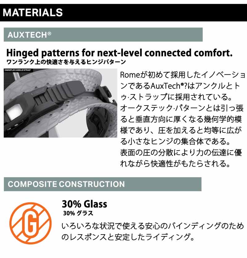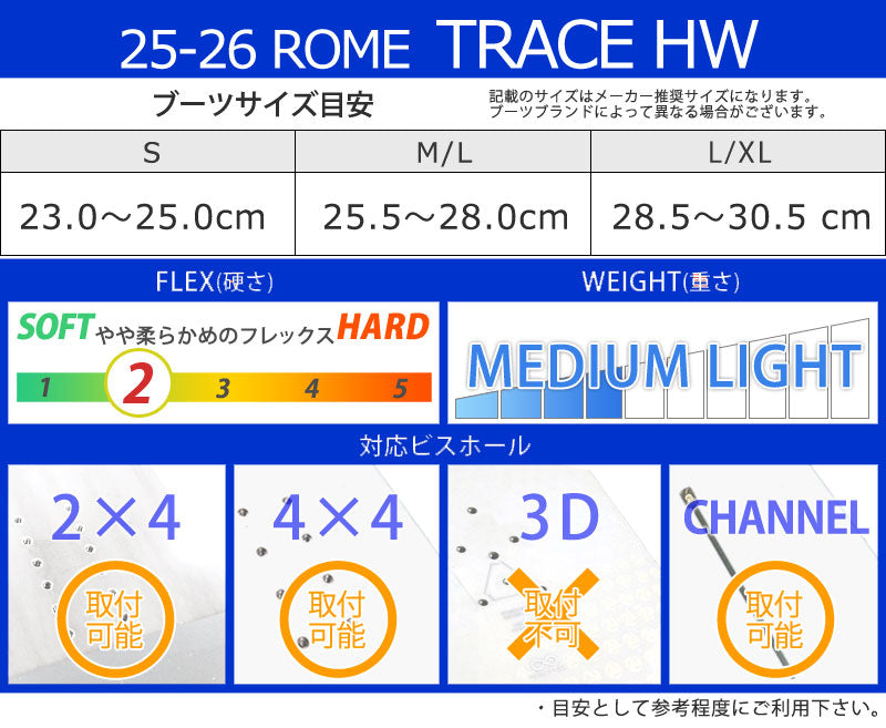 | ベストマッチブーツ | ・ROME/ローム ※ご使用サイズやモデル等で変わる部分もございますのであくまで目安としてお考え下さい。 こちらに記載以外のバインディングにも使用可能です。 |