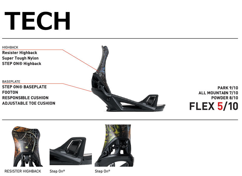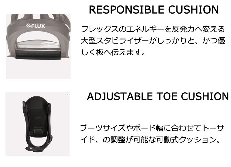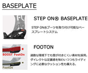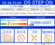 FLUXのメインモデルDSをSTEP ONシステムに落とし込みました。 ハイバックとフットベッドクッションの硬さやねじれを調整し、STEP ONの脱着の快適さとDSの遊びやすさを両立したバインディングとなりました。 ゲレンデクルージングからパウダー、またパークまで、脱着のわずらわしさに妨げられることなく、最高なスノーボーディングを一日中楽しめます。 バインディングとブーツの相性やフィッティングに関して等、ご不明な点があればお気軽にお問い合わせください。 ※滑走での振動やストラップの着脱等でビスを使用している部分は緩んできますので、締り具合など滑走前に必ずご確認をお願いします。またご使用のブーツとストラップの調整をお願いいたします。調整が適切でない場合、負荷が集中し破損の原因となります。 |
