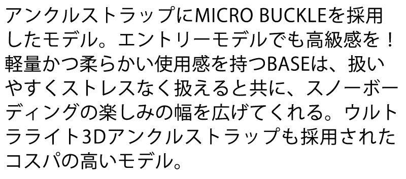 アンクルストラップにMICRO BUCKLEを採用したモデル。エントリーモデルでも高級感を!軽量かつ柔らかい使用感を持つBASE+は、扱いやすくストレスなく扱えると共に、スノーボーディングの楽しみの幅を広げてくれる。ウルトラライト3Dアンクルストラップも採用されたコスパの高いモデル。 バインディングとブーツの相性やフィッティングに関して等、ご不明な点があればお気軽にお問い合わせください。 ※滑走での振動やストラップの着脱等でビスを使用している部分は緩んできますので、締り具合など滑走前に必ずご確認をお願いします。またご使用のブーツとストラップの調整をお願いいたします。調整が適切でない場合、負荷が集中し破損の原因となります。 |
