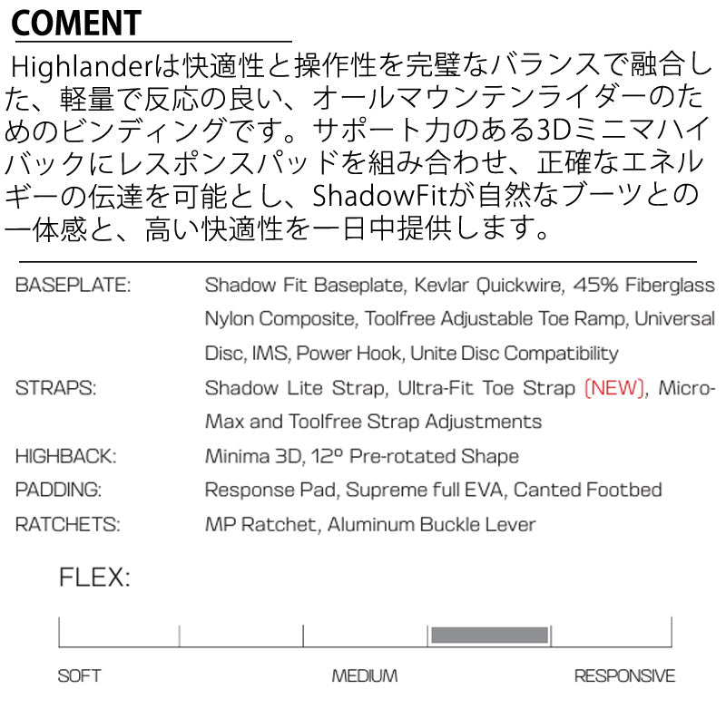 Highlanderは快適性と操作性を完璧なバランスで融合した、軽量で反応の良い、オールマウンテンライダーのためのビンディングです。サポート力のある3Dミニマハイバックにレスポンスパッドを組み合わせ、正確なエネルギーの伝達を可能とし、ShadowFitが自然なブーツとの一体感と、高い快適性を一日中提供します。 バインディングとブーツの相性やフィッティングに関して等、ご不明な点があればお気軽にお問い合わせください。 ※滑走での振動やストラップの着脱等でビスを使用している部分は緩んできますので、締り具合など滑走前に必ずご確認をお願いします。またご使用のブーツとストラップの調整をお願いいたします。調整が適切でない場合、負荷が集中し破損の原因となります。 |