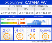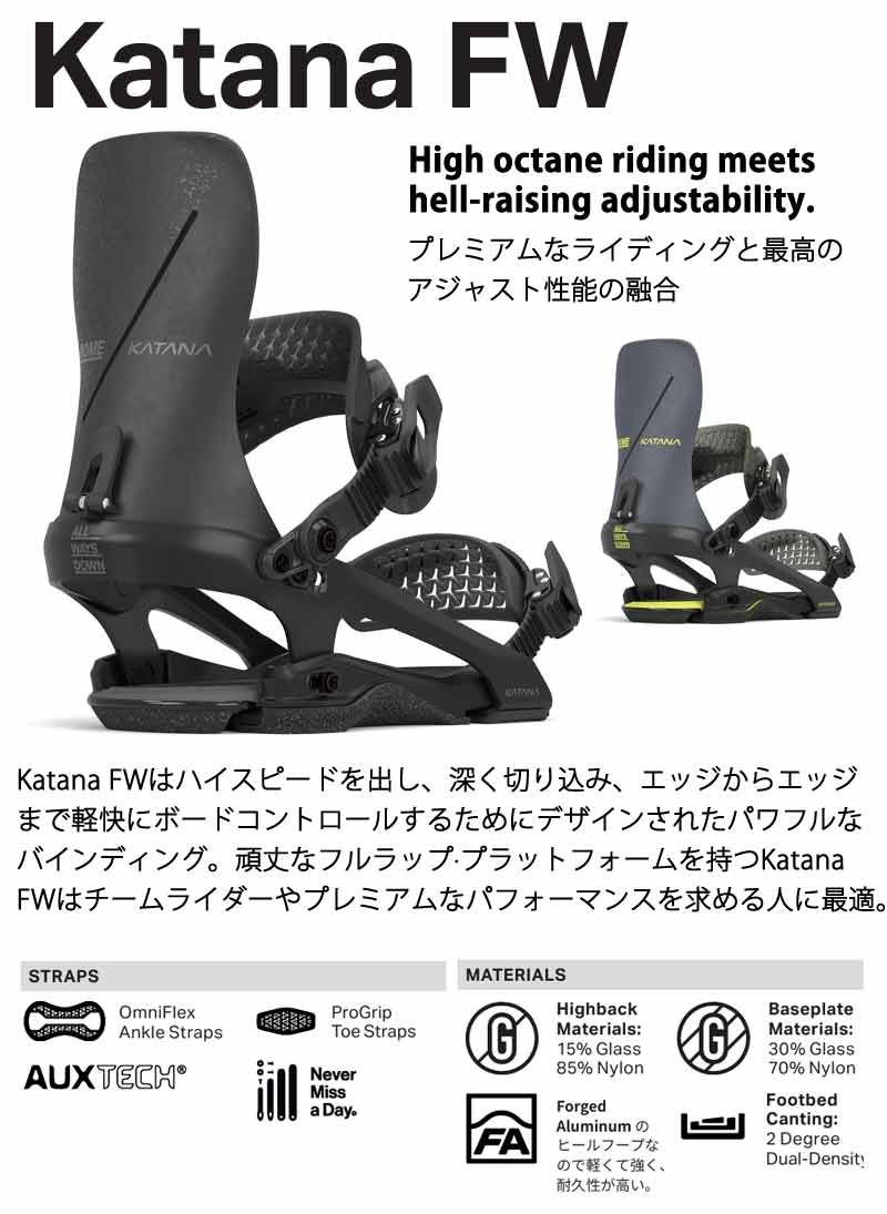 Katana FWはハイスピードを出し、深く切り込み、エッジからエッジまで軽快にボードコントロールするためにデザインされたパワフルなバインディング。頑丈なフルラップ?プラットフォームを持つKatana FWはチームライダーやプレミアムなパフォーマンスを求める人に最適。 バインディングとブーツの相性やフィッティングに関して等、ご不明な点があればお気軽にお問い合わせください。 ※滑走での振動やストラップの着脱等でビスを使用している部分は緩んできますので、締り具合など滑走前に必ずご確認をお願いします。またご使用のブーツとストラップの調整をお願いいたします。調整が適切でない場合、負荷が集中し破損の原因となります。 |